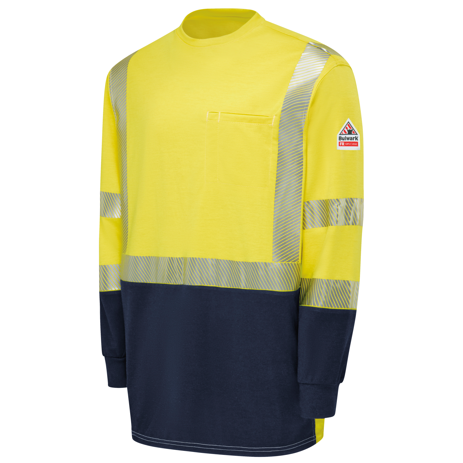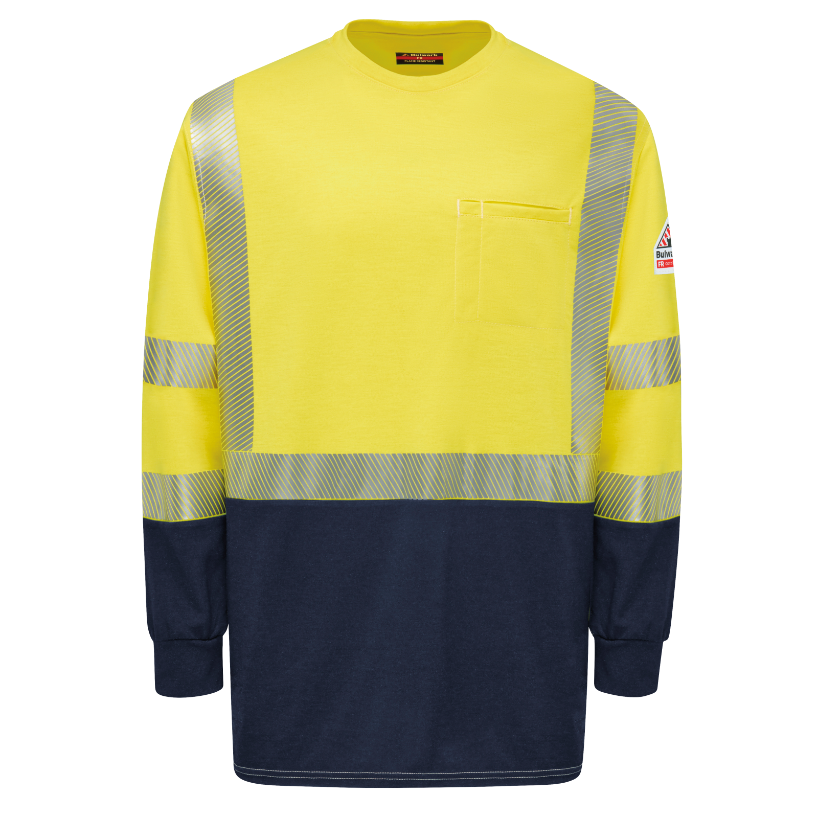 Esta camiseta de alta visibilidad con bloques de color es la mejor combinación de protección FR, cumplimiento de alta visibilidad y comodidad. Visibilidad de 360° en la parte delantera y trasera, franjas reflectantes selladas con calor segmentadas plateadas resistentes al fuego de 2", bolsillo oculto en el pecho con compartimento para lápices incorporado para una apariencia profesional, el tejido azul marino con bloques de color oculta la suciedad y las manchas en las áreas que más lo necesitan.